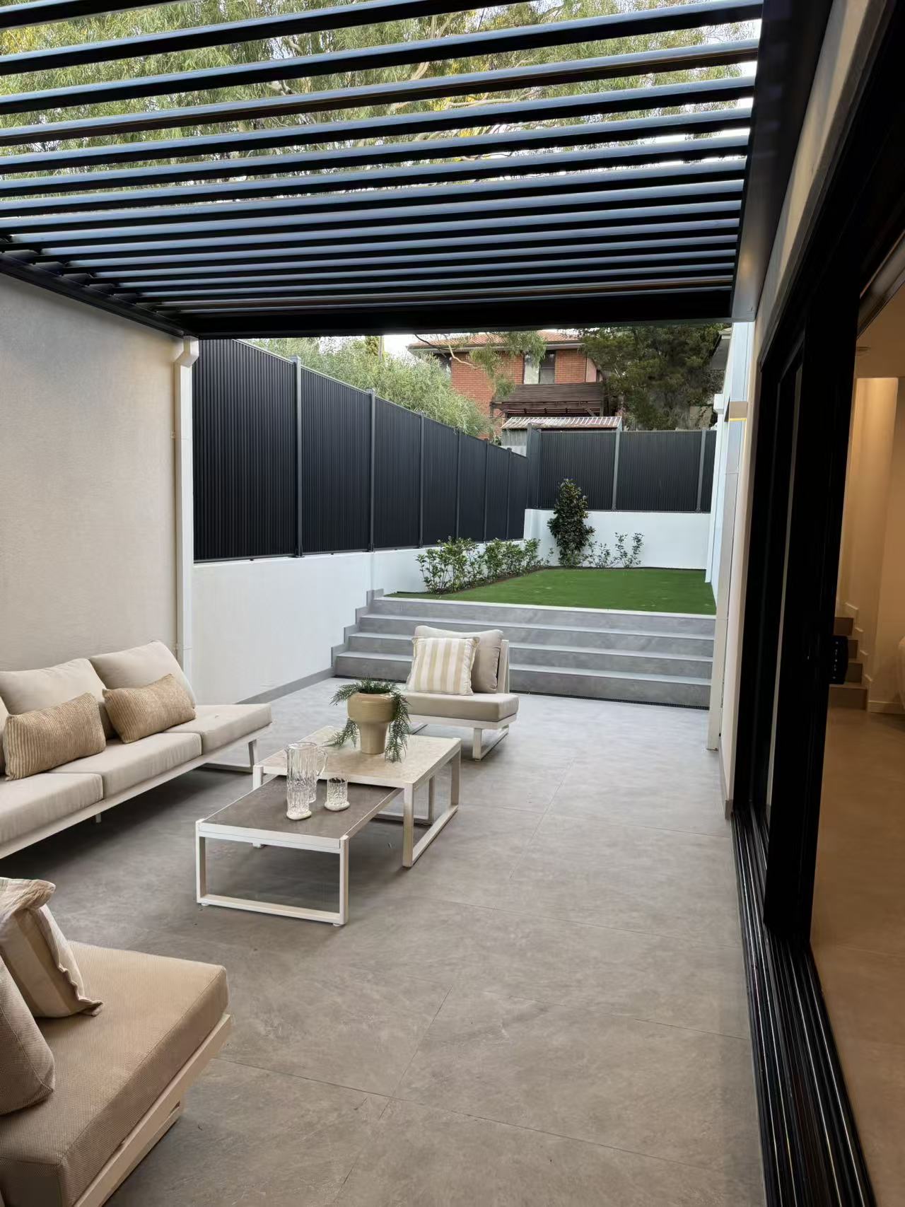 Extending indoors to outdoors, the covered terrace (framed by black slatted screening) mirrors the interior’s muted palette, with grey paving that ties the living space to the landscaped courtyard. The result is a cohesive, calm home that feels both refined and lived-in.
