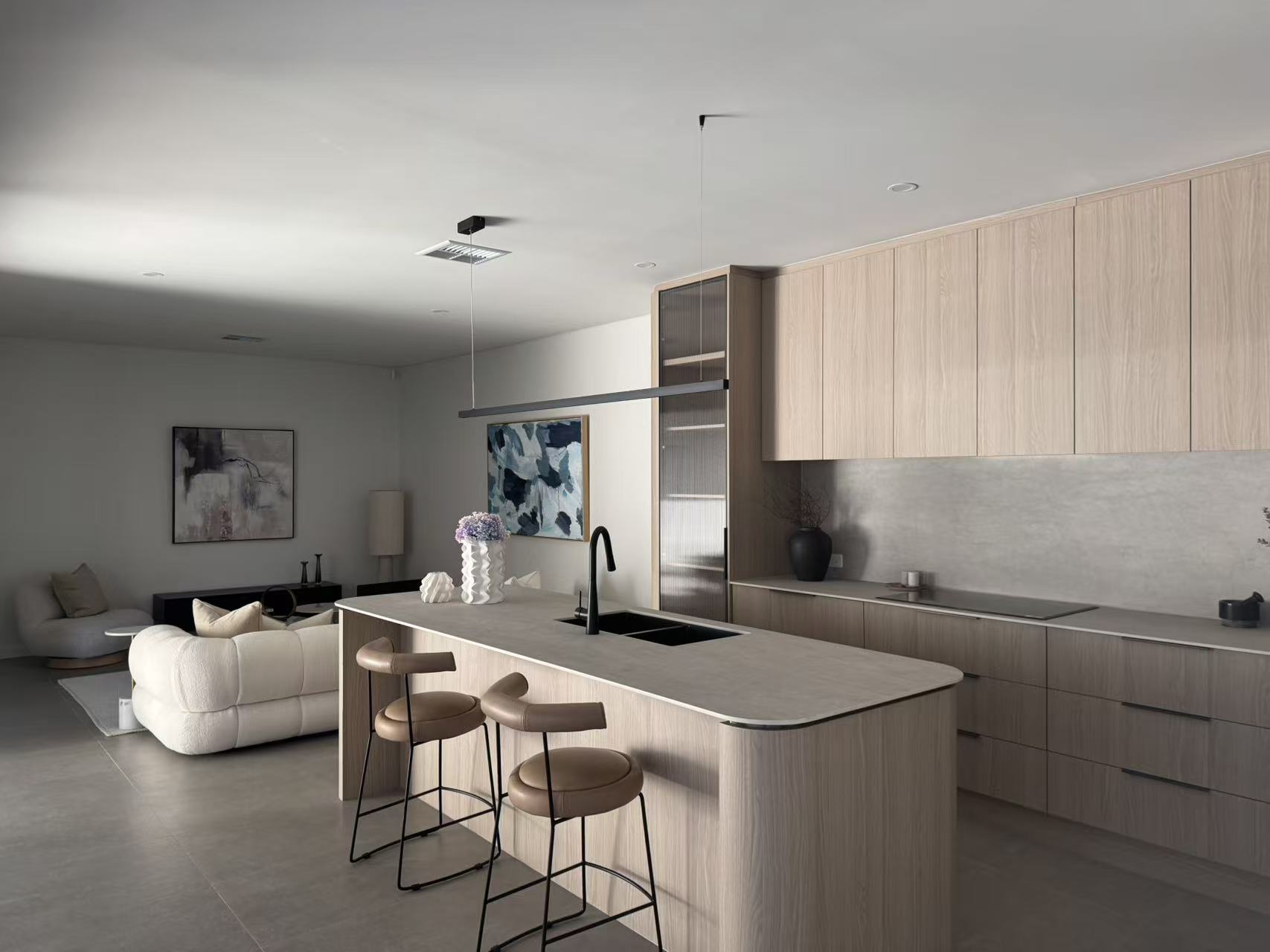The interior anchors itself in warm light wood finishes and soft neutral greys: the open-concept kitchen-dining island (with integrated storage and clean-lined cabinetry) merges seamlessly with the living area, while subtle design details—like the frosted glass partition—balance privacy and spatial openness.