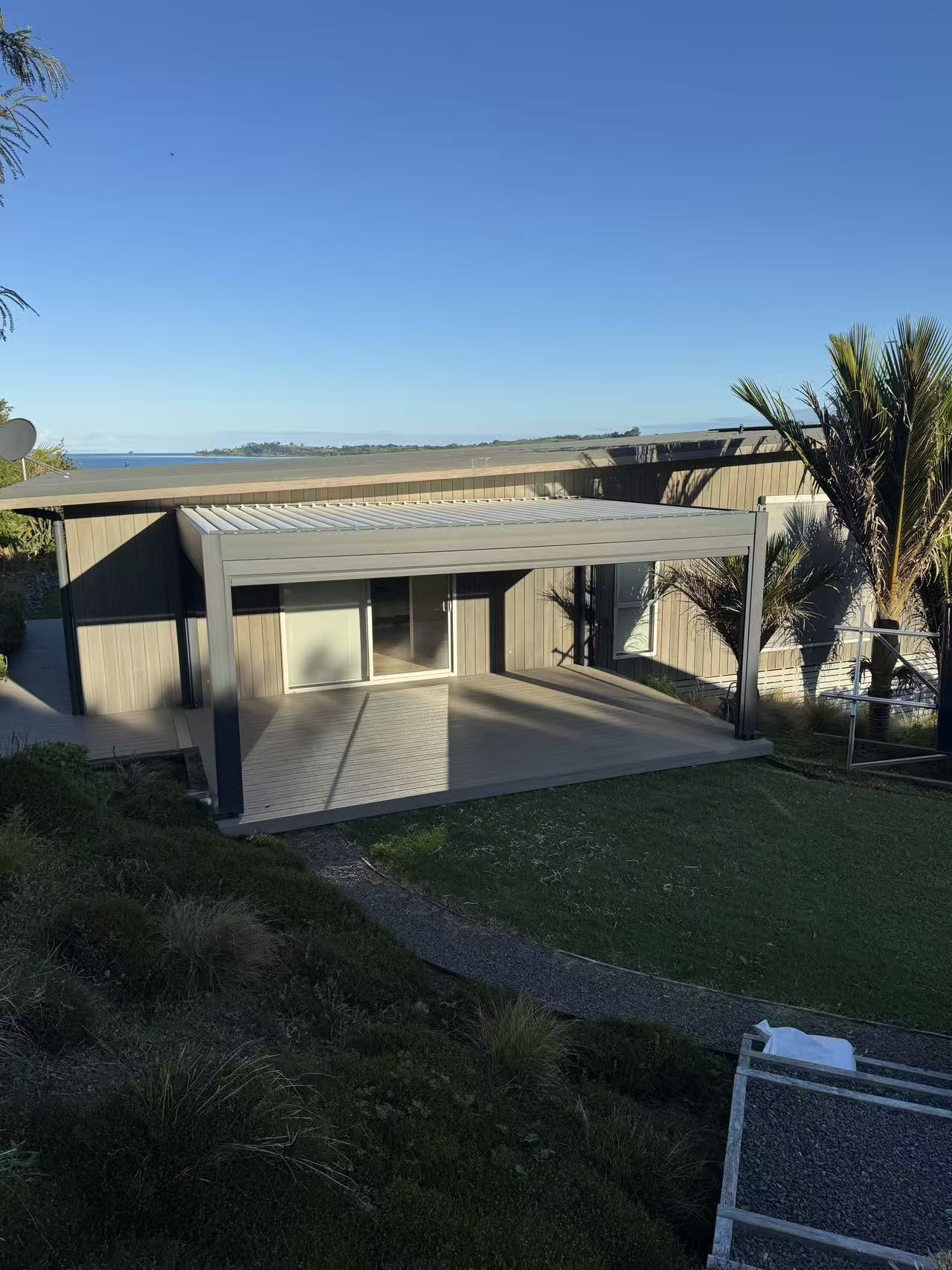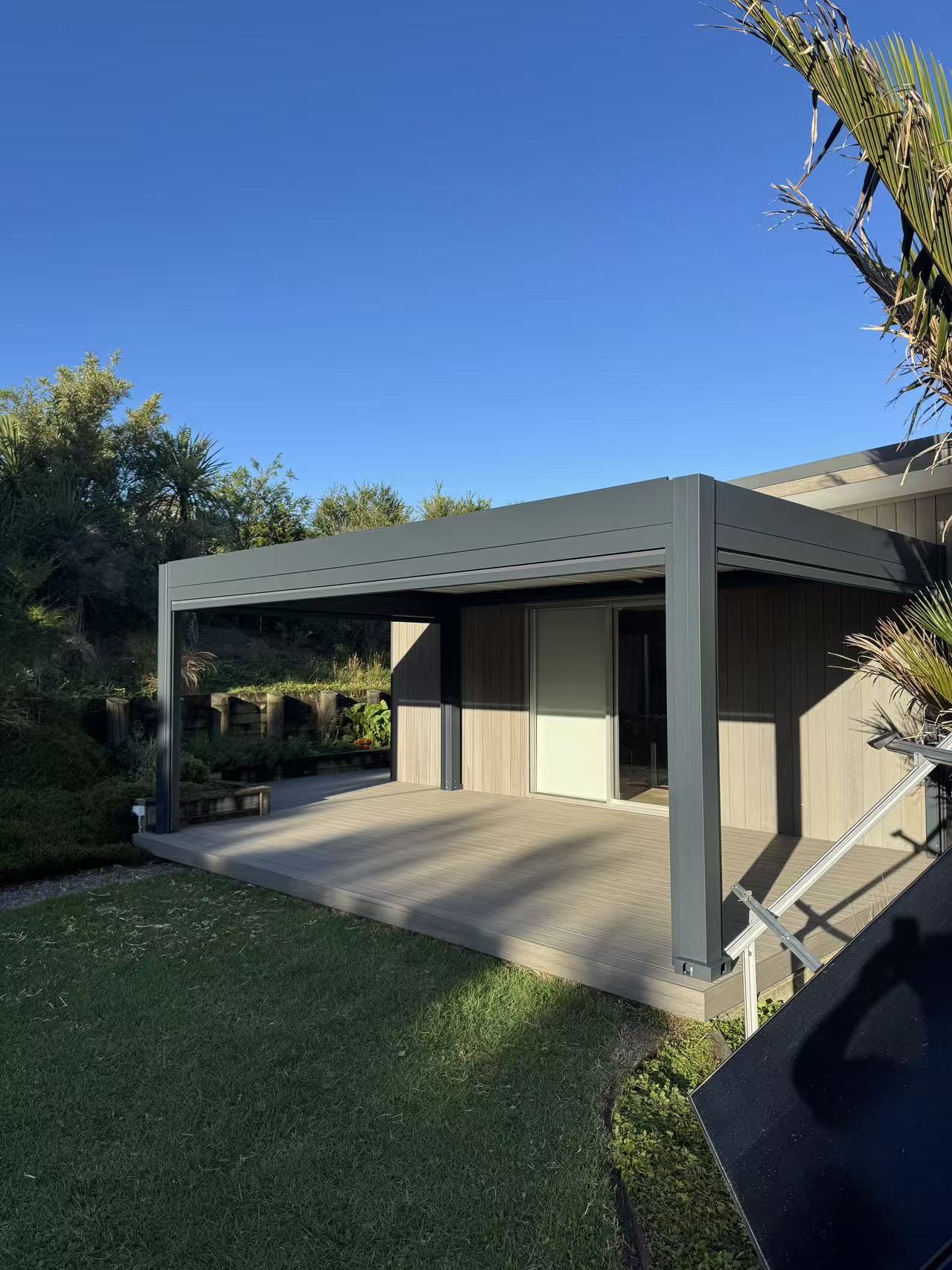 This sleek aluminum pergola seamlessly extends the outdoor living space, perfectly suited for coastal environments. Featuring a clean flat-roof design with integrated louvers, it provides adjustable shade, weather protection, and a minimalist aesthetic.